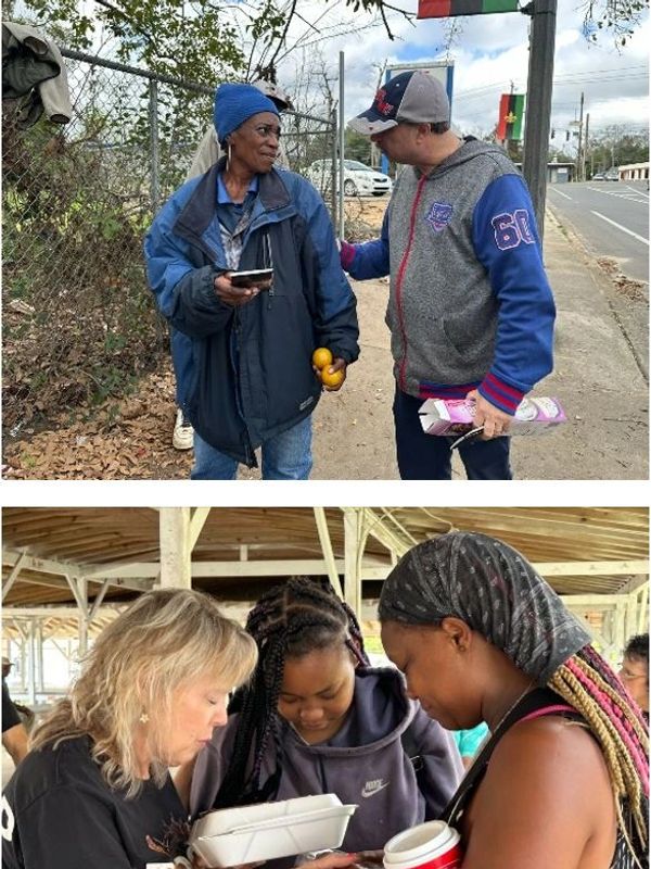 We rent booths at a local flea market and distribute food including fresh produce, baked goods and nonperishable items. We also distribute clothing and bibles. We drive to places where the homeless congregate and bring food, clothing and bibles, but also include blankets, personal hygiene kits, tents, and flashlights. Everyone is offered prayer for their needs and salvation through Christ.